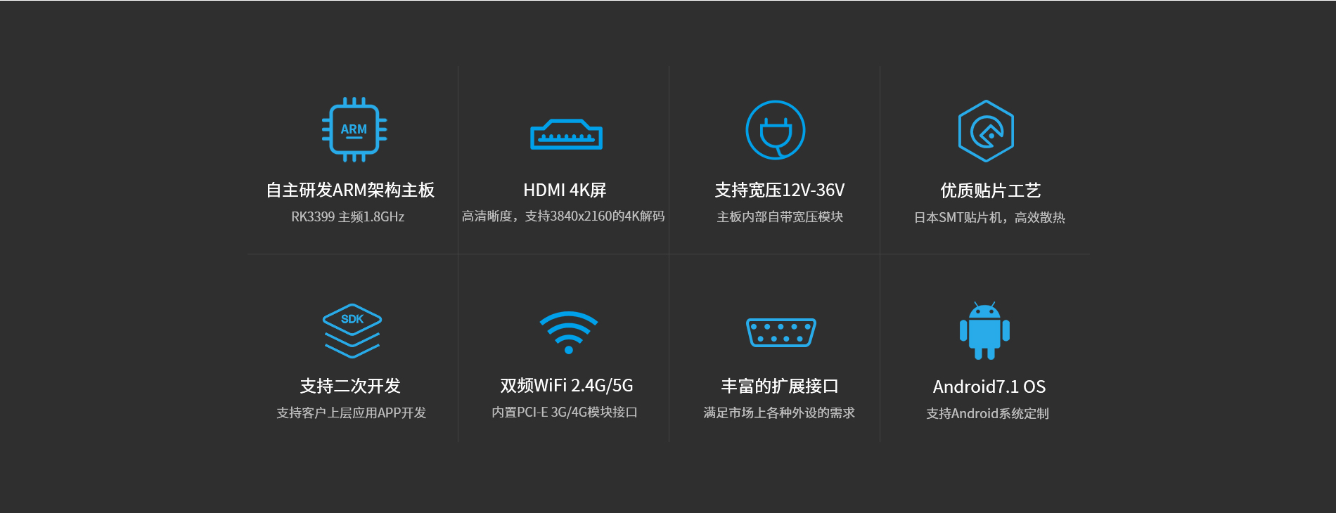 多種顯示輸出接口 豐富的擴(kuò)展接口 Android 7.1/9.0 支持多種主流觸摸屏 64位高性能CPU,1.8GHz 2大核+4小核 多種網(wǎng)絡(luò)接口,支持上網(wǎng)和通話